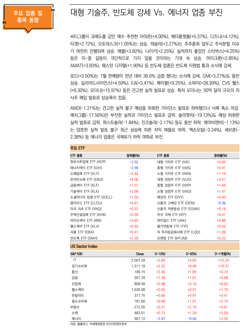 금일 테마 ETF에서는 기술혁신(ARKK/+6.1%) ETF와 생명공학(IBB/+3.8%) ETF 등이 상승 마감. 특히 생명공학(IBB) ETF에서 모더나(MRNA/+16.0%)가 월 스트리트의 예상치를 상회하는 지난 2분기 실적과 매출을 기록하였다고 공개하며 주가가 급등. 동 테마 ETF 내의 종목 길리어드 사이언시스(GILD/+4.6%) 또한 월가의 예상치를 크게 상회하는 실적을 발표함에 따라 상승세를 시현하며 생명공학(IBB) ETF를 견인.