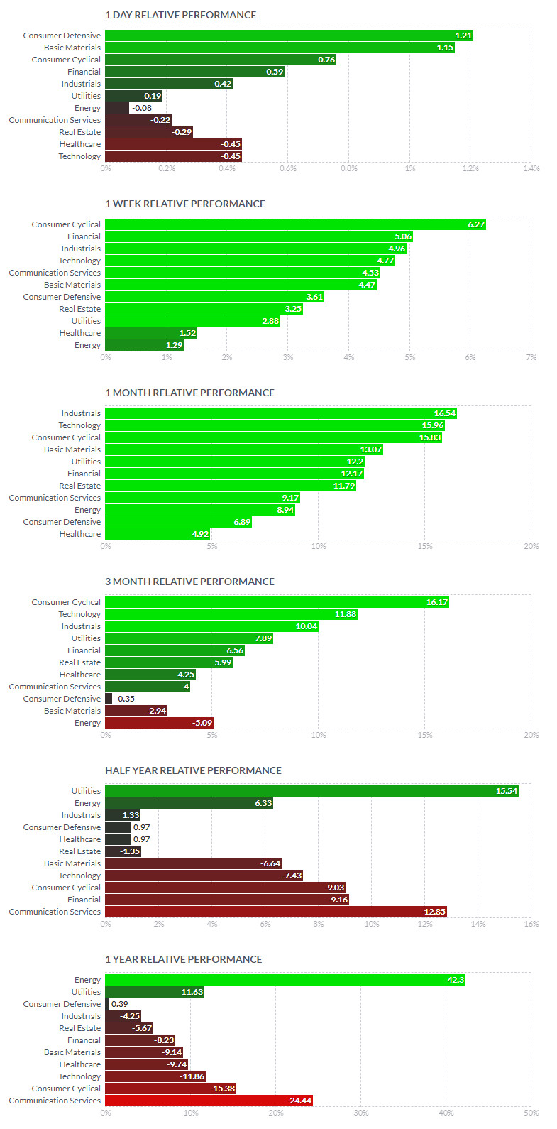 | IT | XLK | 151.1 | -0.3% | 햇빛 | 8.6% | 13.0% | -2.2% |