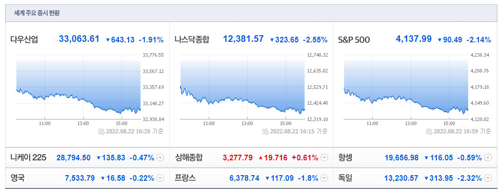| 8월 22일(월) 증시캘린더 / 해외마감시황 (1) | 2022.08.22 |