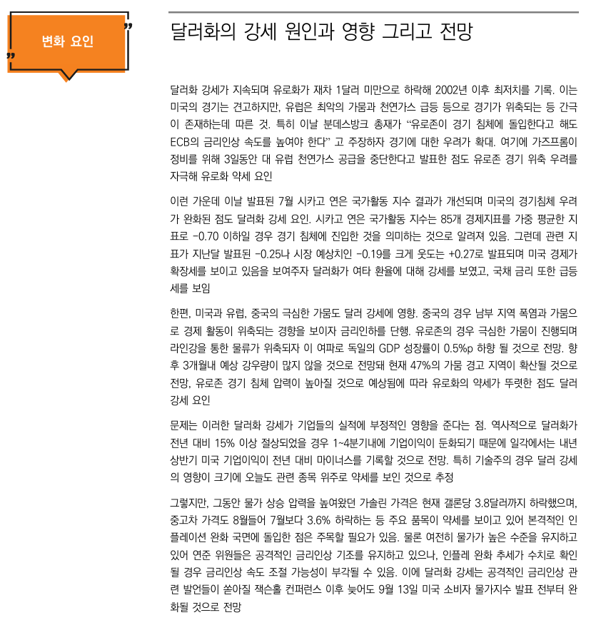 금일 뉴욕 증시는 미국의 주요 경제 포럼인 잭슨홀을 주시하며 미연방준비제도(Fed)의 강력한 매파적 스탠스를 재확인 할 것으로 예상. 이에 공격적 기준 금리 인상에 따른 경기 둔화 가능성에 투자심리가 위축되며 S&P500 지수와 나스닥 지수 모두 2.0% 이상 크게 하락한 4,137.9선과 12,381.6선으로 거래를 마감. 제롬 파월 미국연방준비제도 의장은 미국 와이오밍주에 위치한 잭슨홀에서 오는 26일 경제 연설을 할 예정인 가운데 일부 연방준비제도 당국자들의 75bp기준금리 인상 필요성에 대한 발언이 언급되며 위험 회피 심리와 함께 증시 낙폭을 확대하는 요인으로 작용. 또한 유럽의 러시아산 경제재제에 따른 에너지 리스크에 대한 우려가 고조된 상황에서 러시아는 유럽 천연가스 공급망인 ‘노드스트림-1’의 유지 보수를 위해 천연가스 공급을 이달 말일부터 3일간 중단할 것이라고 밝히며 유로화 약세 및 달러 강세를 지지. 한편 일각에서는 미국의 GDP 성장률을 잇따라 하향 조절 하며 2023년 하반 기부터 장기간의 경기 침체를 예상. 특히 경기 침체가 장기화됨에 따라 소비시장 위축이 점차 가시화 되며 관련 기업들의 매출 및 이익률 하락이 불가피 할 것이란 분석이 제기.