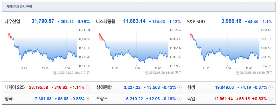 | 8월 30일(화) 증시캘린더 / 해외마감시황 (1) | 2022.08.30 |