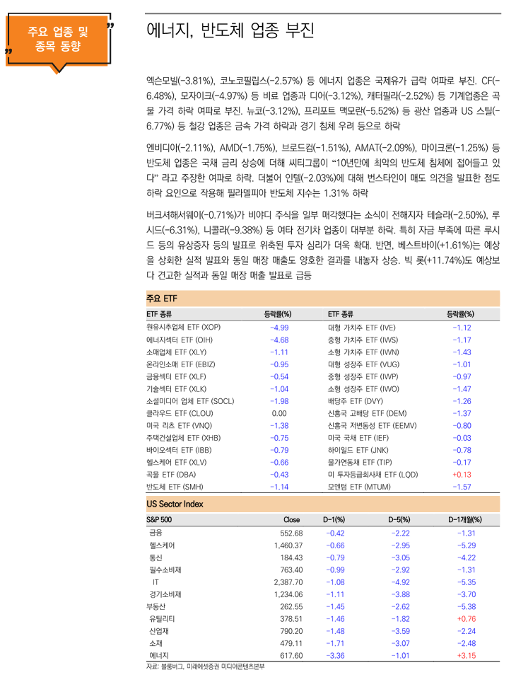 섹터별 ETF는 IT(XLK/-1.1%)섹터와 산업재(XLI/-1.5%)섹터가 하락 마감. 글로벌 투자 기업 시티그룹은 자동차 반도체 시장에서의 수요 둔화와 재고 과잉 문제를 언급하며 반도체 생산 업체들에 대해 보다 방어적인 투자 포지션의 필요성을 역설. 특히 글로벌 PC시장에서의 이러한 반도체 수요 둔화는 더 뚜렷하게 나타나고 있다고 분석하며 글로벌 경기 둔화로 인한 추가적인 주가 하락 가능성을 전망. 한편 산업 용품 제조 업체 3M(MMM)의 귀마개 소송과 관련하여 해당 소송의 규모가 대략 140억 달러의 규모라는 분석이 제기되며 주가는 1.2% 하락. 특히 이번 소송 패소 가능성에 따른 당사의 장기적인 주가 하락 리스크 우려가 상승하며 산업재 섹터의 하방 압력을 가중.
