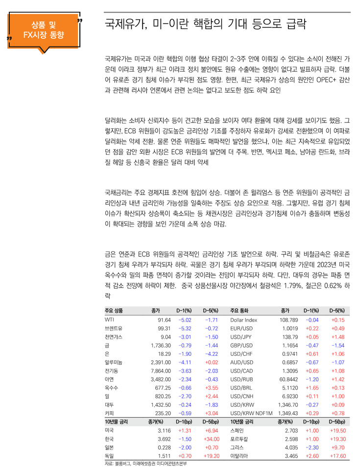 테마별 ETF는 비트코인(BITO/-1.1%)ETF와 인프라(IGF/-1.6%)ETF가 하락 마감. 지난 제롬 파월 미국연방준비제도(Fed) 의장의 금리 인상 발언에 따른 긴축통화정책에 대한 공포가 지속하며 하락을 주도. 반면 일각에서는 인플레이션 고점이 이미 지나간 상황이라 전망하며 내년 초 기준금리 인하 가능성이 언급, 이에 인플레이션 완화에 따른 가상화폐 투자 심리가 다시 살아날 것이라는 의견이 제기. 한편 글로벌 투자은행 골드만 삭스는 원자재 공급 부족 현상을 지목하며 원자재 시장에서의 선물 가격 보다 현물 가격이 높은 백워데이션 현상이 지속할 것이라 전망. 특히 석유 화학 제품의 가격 상승세가 두드러질 것이라 예상하며 인프라 섹터 하락의 주요한 원인으로 작용.