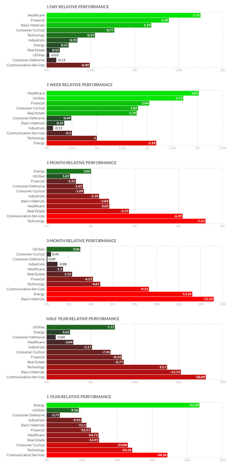 | IT | XLK | 134.6 | 0.4% | 안개 | -8.9% | 7.0% | -13.4% |