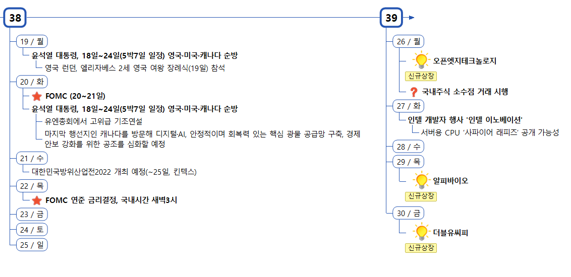 •이전 연준의 의사결정을 보면(결코 컨센이상의 쇼크성 결정을 하지 않는) 9/21 FOMC에서는 75bp인상해 기준금리를 3.25%까지 올려놓고, 이후 남은 두번의 FOMC를 통해 연말 4.0% 금리를 맞출 것으로 추정하며, 이정도는 이미 시장이 모두 반영하고 있는 것으로 판단