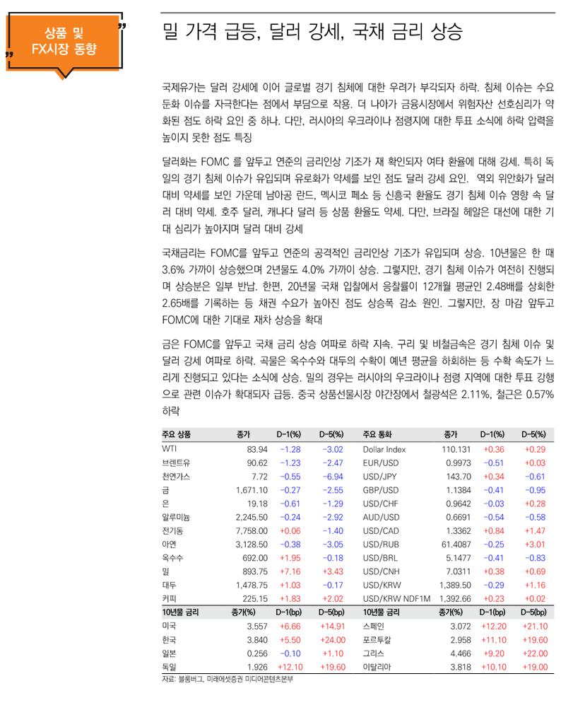 미 증시는 유럽의 경기 침체 우려가 여전한 가운데 포드(-12.32%)의 공급망 불안에 따른 실적 부진 이슈가 투자 심리를 위축시키며 하락 출발. 더불어 FOMC를 앞두고 국채 금리가 금리인상 기조를 반영하며 10년물 기준 3.5%를 상회한 점도 부담. 결국 시장은 경기 위축 이슈가 여전한 가운데 FOMC에 대한 불안 심리로 부진. 다만, 애플(+1.57%) 등은 개별적인 이슈로 강세를 보이며 낙폭 일부 축소되는 등 종목 장세도 특징(다우 -1.01%, 나스닥 -0.95%, S&P500 -1.13%, 러셀2000 -1.40%)