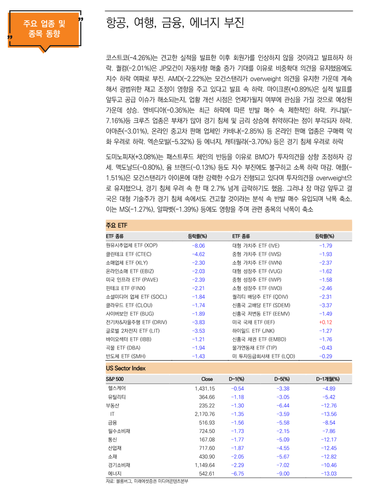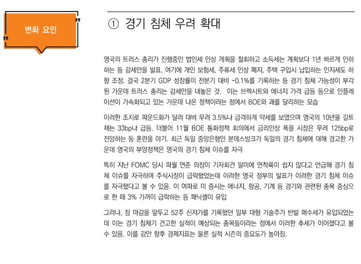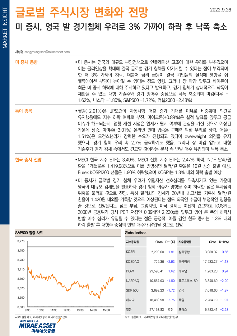 미 증시는 영국의 대규모 부양정책으로 인플레이션 고조에 대한 우려를 부추겼으며 이는 금리인상을 확대해 결국 글로벌 경기 침체를 야기시킬 수 있다는 점이 부각되며 한 때 3% 가까이 하락. 더불어 금리 급등이 결국 기업들의 실적에 영향을 줘 밸류에이션 부담이 높아질 수 있다는 점도 영향. 그러나 장 마감 앞두고 바이든이 최근 미 증시 하락에 대해 주시하고 있다고 발표하고, 경기 침체기 상대적으로 낙폭이 제한될 수 있는 대형 기술주와 경기 방어주 중심으로 낙폭 축소되며 마감(다우 -1.62%, 나스닥 -1.80%, S&P500 -1.72%, 러셀2000 -2.48%)