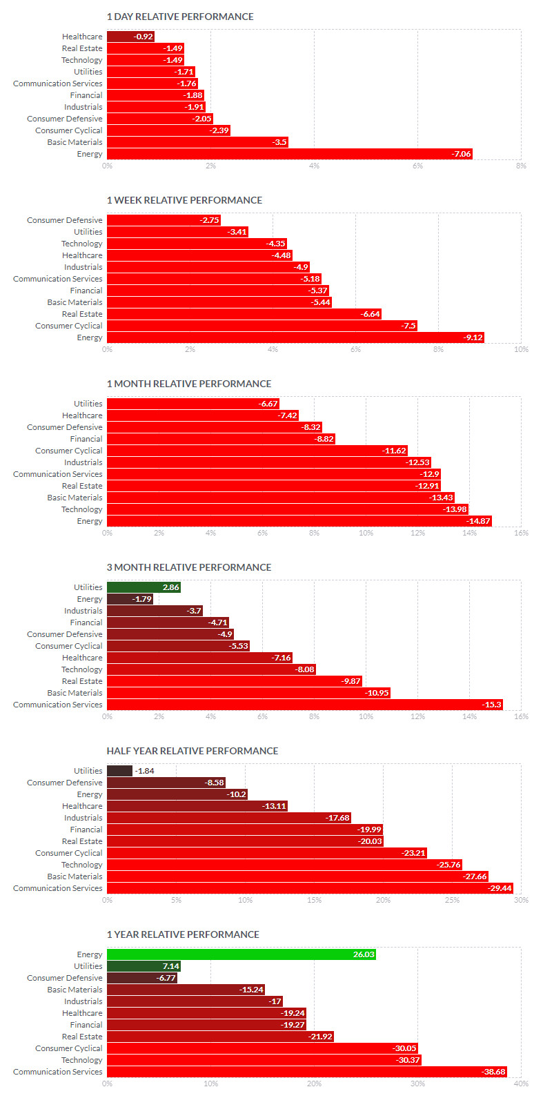 금일 뉴욕 증시는 ‘10년간 이어진 저금리 환경 종식’과 함께 하락세 마감. 글로벌 주간지 Barron’s에 따르면 금리 상승세 속에 미국 증시가 낙폭을 확대하고 있으며, 6월 저점을 하회할 가능성에 대해 언급. 6월 중순부터 8월 중순가지 미국 증시가 뚜렷한 랠리를 경험하기도 했으나, 이후 다시 하락장이 재개되었으며 미 연준의 금리인상 사이클 지속을 재차 강조하면서 하락장은 낙폭을 확대하고 있다고 전달하였고, 이에 대형주 위주의 S&P500 지수는 전장 대비 1.7% 하락한 선을 기록하였으며 기술주 중심의 나스닥 지수는 1.8% 하락한 선으로 장을 마감. Macro Risk Advisors에 따르면 S&P500 지수가 6월 저점 3,666에 근접하는 수준으로 하락했으며 3,800 전후에서는 상승을 기대하는 투자자들이 유입되기도 했지만, 하락세가 재개되면서 낙폭은 더욱 확대될 가능성이 크다고 주장했음. 한편 CMC마켓츠에 따르면 경기 침체 시기에 상승하는 대표적인 안전자산인 금이 달러화의 초강세 현상을 이기지 못하고 큰 폭으로 하락했다고 말함. 12월물 금 선물 가격은 전장 대비 약 1.5% (25.50달러) 급락한 온스당 1,655.60달러에 거래를 마침. 이는 2020년 4월 이후 최저치임을 언급하며 약세장 심리가 금 시장에서도 발생하는 듯하며 기술적인 매도세가 끌어내리고 있는 것으로 추정함.