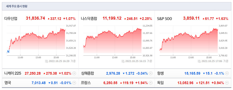 미 증시는 금융안정을 언급한 수낵 영국 총리의 취임사와 미국 주택가격의 급격한 하락 등으로 달러 약세, 국채 금리 하락이 확대되자 상승 출발. 여기에 개별 기업들의 긍정적인 실적과 일부 개별 기업 호재성 재료 유입, 그리고 이러한 호재성 재료의 업종 전반 확대로 인한 투자심리 개선 효과도 긍정적인 영향. 특히 그동안 낙폭이 컸던 전기차, 소프트웨어, 일부 반도체 업종 등이 상승을 주도(다우 +1.07%, 나스닥 +2.25%, S&P500 +1.63%, 러셀2000 +2.73%)