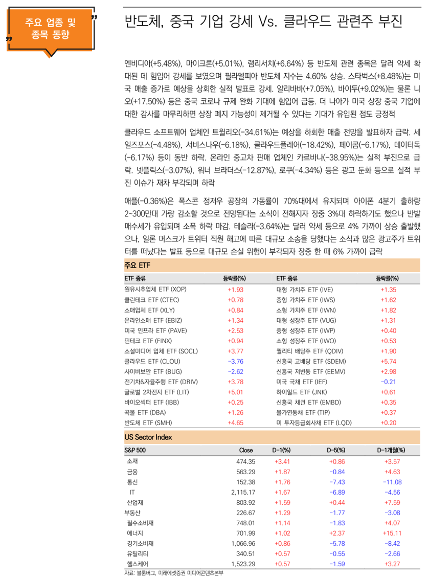 | PHLX 반도체지수 | 2,398.24 | 105.38 | 4.6% | 29/1/0 |