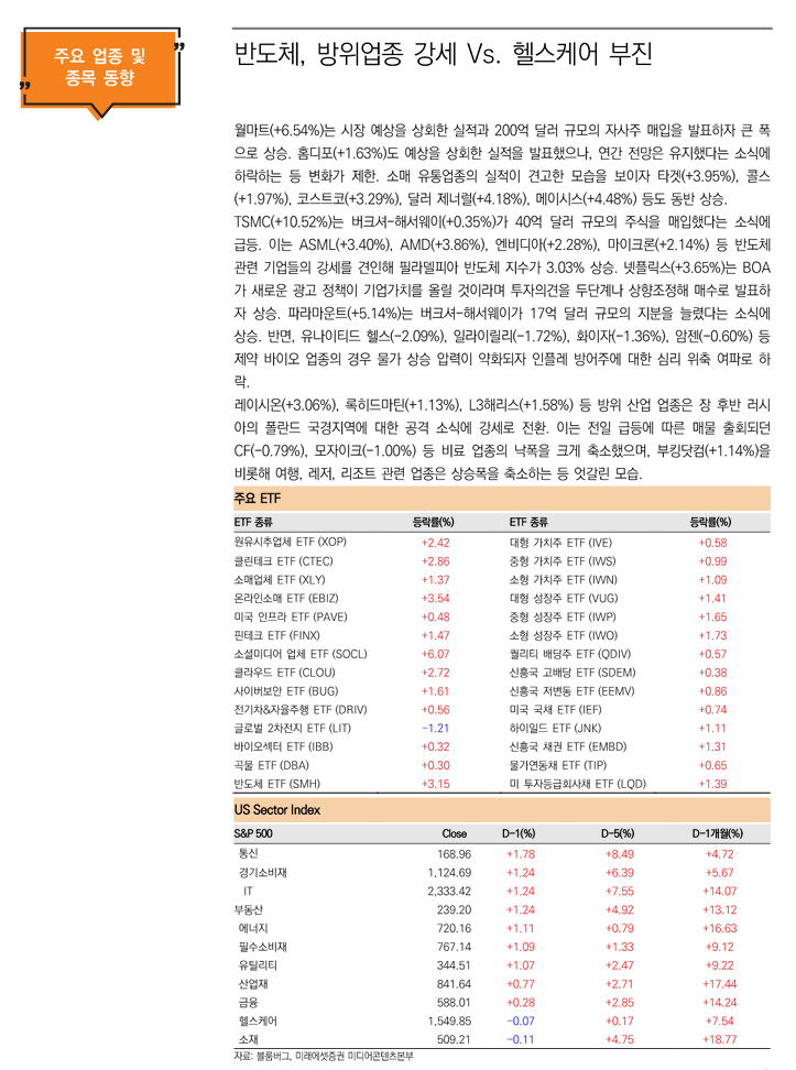 한편, 소매 유통업종의 견고한 실적 발표도 한국 증시에 긍정적. 이는 미국의 소비가 양호한 모습을 보이고 있어 미국발 경기 침체 우려가 높아질 가능성이 높지 않기 때문. 더불어 전일 일부 반영이 되었지만, 필라델피아 반도체 지수가 3.03% 상승하는 등 반도체 업종에 대한 긍정적인 투자 심리가 유지되고 있다는 점도 우호적.