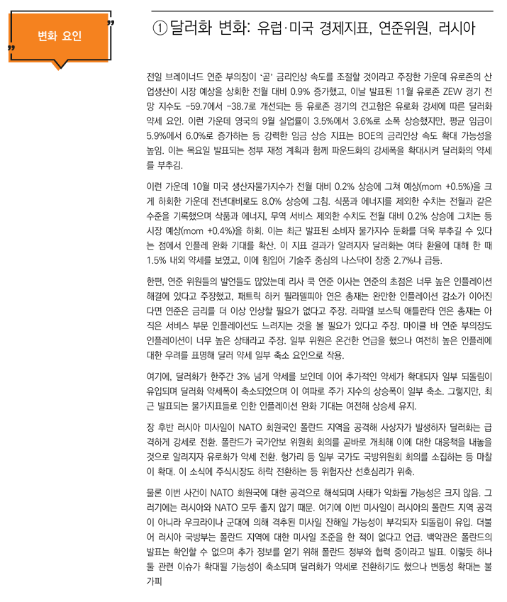 변화요인: ①달러화 변화: 유럽·미국 경제지표, 연준위원, 러시아
