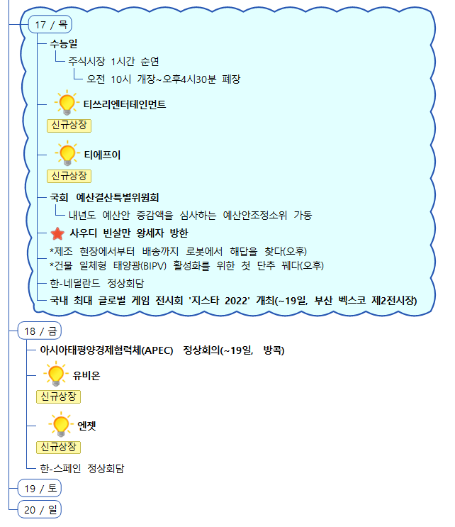 | 11월 18일(금) 증시캘린더 / 해외마감시황 (1) | 2022.11.18 |