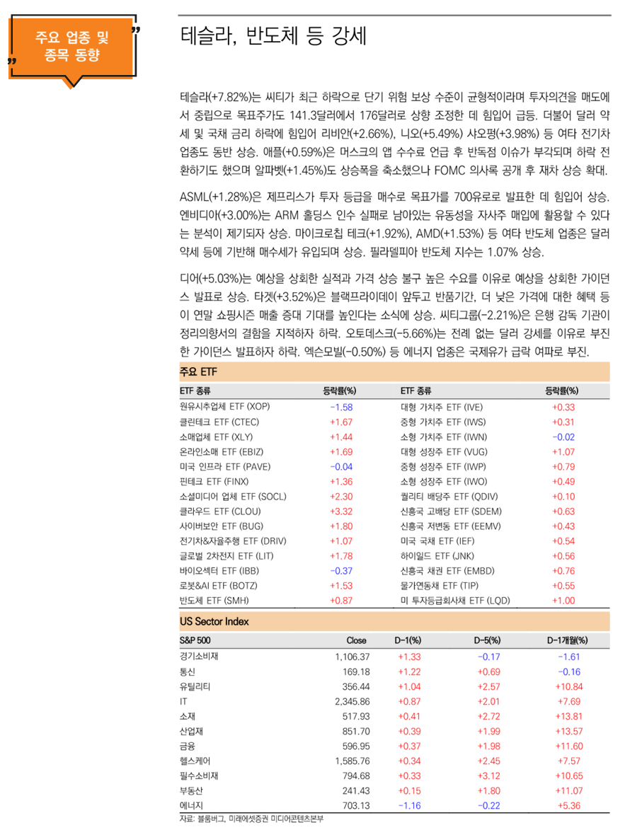 미 증시가 장 중 일부 종목 이슈로 상승분을 반납하기도 했으나, 달러 약세 및 국채 금리 하락에 힘입어 상승한 점은 한국 증시에 긍정적인 영향을 줄 것으로 전망. 특히 반도체 업종의 강세가 뚜렷한 가운데 필라델피아 반도체 지수가 1.07% 상승한 점도 전일에 이어 관련 기업들의 투자 심리에 긍정적인 영향을 줄 것으로 전망.