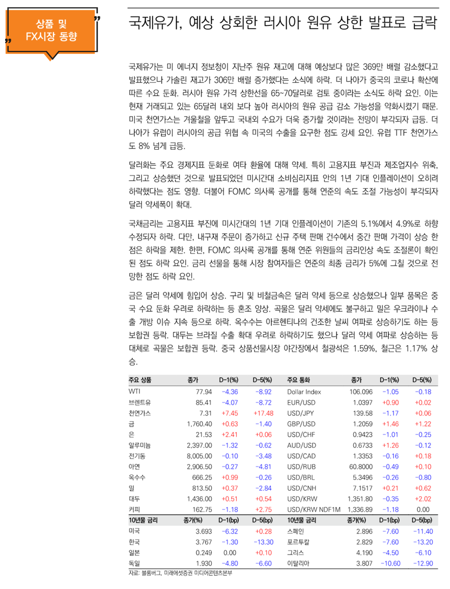 - 브렌트유: 85.41 (-3.60, -4.07%)