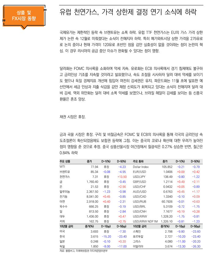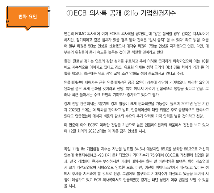 미 증시가 휴장인 가운데 유럽 증시는 ECB가 연준에 이어 의사록 공개를 통해 금리인상 속도 조절을 시사하는 내용을 발표한 점은 한국 증시에 우호적인 영향을 줄 것으로 전망. 물론, ECB는 단기적으로는 경기가 둔화될 것으로 전망했으나, 내년 하반기 경기에 대한 자신감을 표명한 점, 실제 독일의 11월 Ifo 기업환경지수가 기대지수 개선에 힘입어 양호한 결과를 내놓은 점도 우호적. 전일 한국은행도 내년 하반기 경기에 대해 긍정적인 전망을 언급하는 등 글로벌 각국은 내년 상반기까지 경기 둔화 우려가 있으나 ‘경착륙’ 가능성이 크지 않음을 시사했기 때문.
