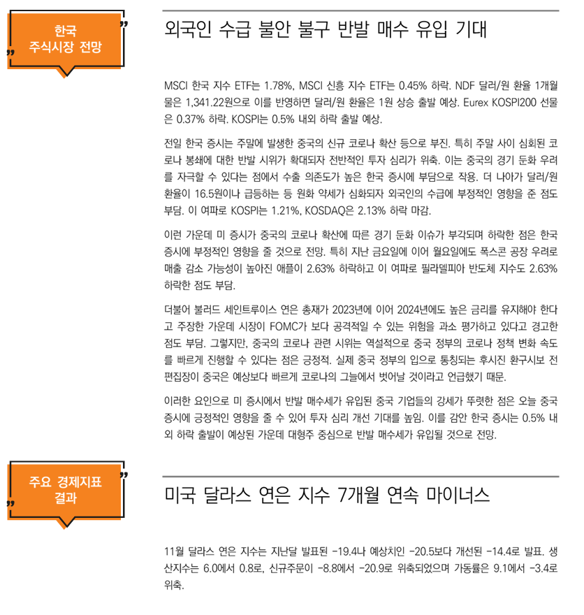 더불어 불러드 세인트루이스 연은 총재가 2023년에 이어 2024년에도 높은 금리를 유지해야 한다고 주장한 가운데 시장이 FOMC가 보다 공격적일 수 있는 위험을 과소 평가하고 있다고 경고한 점도 부담. 그렇지만, 중국의 코로나 관련 시위는 역설적으로 중국 정부의 코로나 정책 변화 속도를 빠르게 진행할 수 있다는 점은 긍정적. 실제 중국 정부의 입으로 통칭되는 후시진 환구시보 전 편집장이 중국은 예상보다 빠르게 코로나의 그늘에서 벗어날 것이라고 언급했기 때문.
