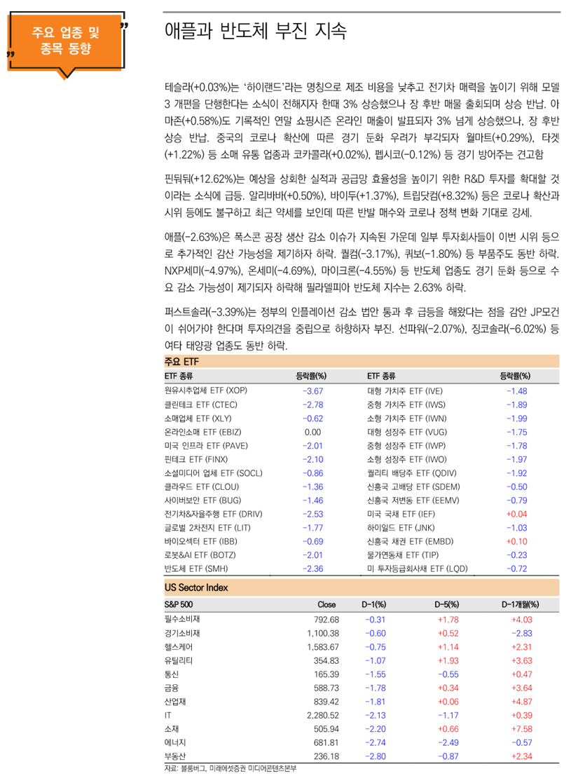 미 증시가 중국의 코로나 확산에 따른 경기 둔화 이슈가 부각되며 하락한 점은 한국 증시에 부정적인 영향을 줄 것으로 전망. 특히 지난 금요일에 이어 월요일에도 폭스콘 공장 우려로 매출 감소 가능성이 높아진 애플이 2.63% 하락하고 이 여파로 필라델피아 반도체 지수도 2.63% 하락한 점도 부담.