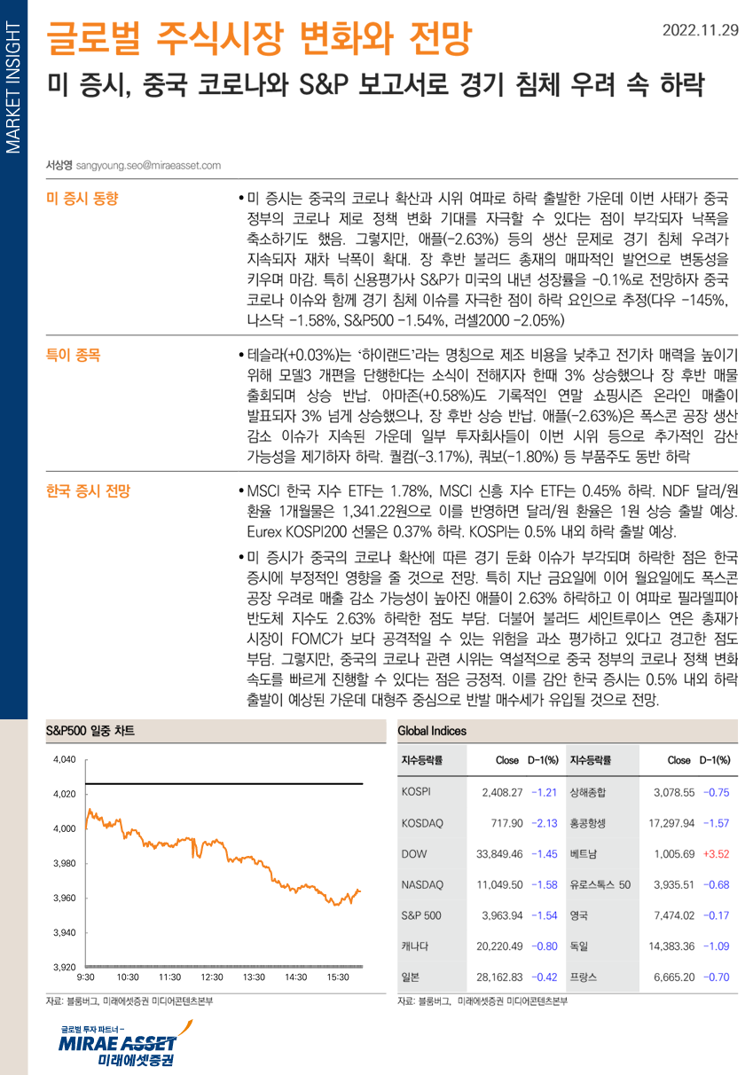 미 증시는 중국의 코로나 확산과 시위 여파로 하락 출발한 가운데 이번 사태가 중국 정부의 코로나 제로 정책 변화 기대를 자극할 수 있다는 점이 부각되자 낙폭을 축소하기도 했음. 그렇지만, 애플(-2.63%) 등의 생산 문제로 경기 침체 우려가 지속되자 재차 낙폭이 확대. 장 후반 불러드 총재의 매파적인 발언으로 변동성을 키우며 마감. 특히 신용평가사 S&P가 미국의 내년 성장률을 -0.1%로 전망하자 중국 코로나 이슈와 함께 경기 침체 이슈를 자극한 점이 하락 요인으로 추정(다우 -145%, 나스닥 -1.58%, S&P500 -1.54%, 러셀2000 -2.05%)
