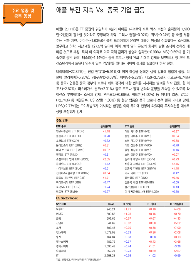 미 증시는 중국의 코로나 정책 완화 소식에도 불구하고 애플의 부진 등 개별 기업들의 하락 요인 여파로 나스닥이 부진한 모습을 보여 한국 증시에 부정적인 영향을 줄 것으로 전망. 그러나 애플의 하락 요인은 최근 많은 부분 알려져 있었다는 점, 애플 부품주는 애플에 비해 상대적으로 양호했다는 점, 나스닥 하락을 부추긴 애플 이외에 아마존과 테슬라 이슈도 개별 요인이라는 점을 감안 한국 증시에 미치는 부정적인 영향은 제한될 것으로 전망.