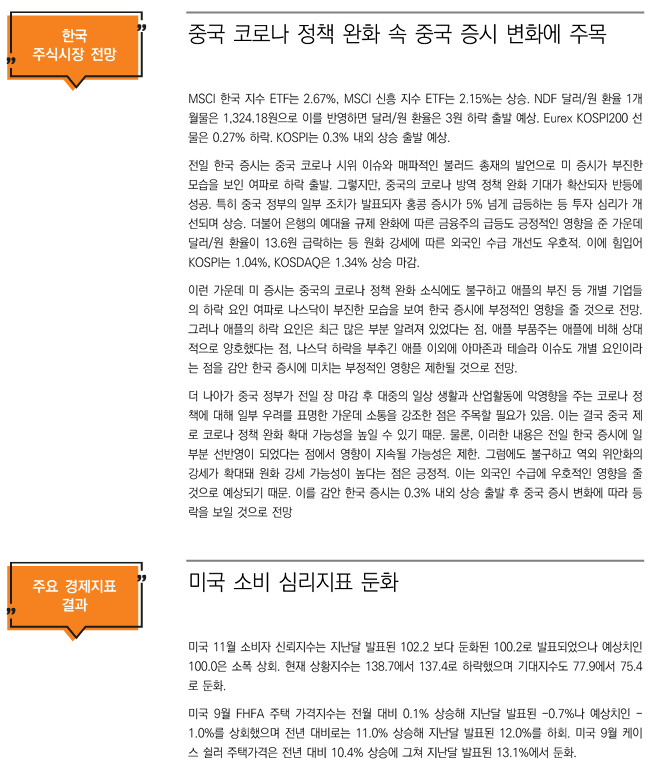 더 나아가 중국 정부가 전일 장 마감 후 대중의 일상 생활과 산업활동에 악영향을 주는 코로나 정책에 대해 일부 우려를 표명한 가운데 소통을 강조한 점은 주목할 필요가 있음. 이는 결국 중국 제로 코로나 정책 완화 확대 가능성을 높일 수 있기 때문. 물론, 이러한 내용은 전일 한국 증시에 일부분 선반영이 되었다는 점에서 영향이 지속될 가능성은 제한. 그럼에도 불구하고 역외 위안화의 강세가 확대돼 원화 강세 가능성이 높다는 점은 긍정적. 이는 외국인 수급에 우호적인 영향을 줄 것으로 예상되기 때문. 이를 감안 한국 증시는 0.3% 내외 상승 출발 후 중국 증시 변화에 따라 등락을 보일 것으로 전망