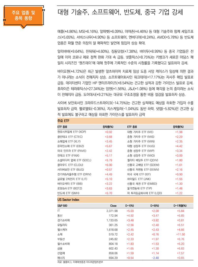 미 증시가 덜 매파적인 파월 연준의장의 발언에 힘입어 기술주 중심의 나스닥이 3% 넘게 급등한 점은 한국 증시에 긍정적인 영향을 줄 것으로 전망. 더불어 미 레이몬도 상무장관이 중국과의 분리를 추구하지 않는다며 관계 개선을 언급한 점도 우호적. 물론, 여전히 대 중국 견제는 지속하겠지만, 이러한 발언은 미-중 갈등 완화 기대를 높인다는 점에서 미, 중 수출이 많은 한국 증시에 긍정적인 요인.