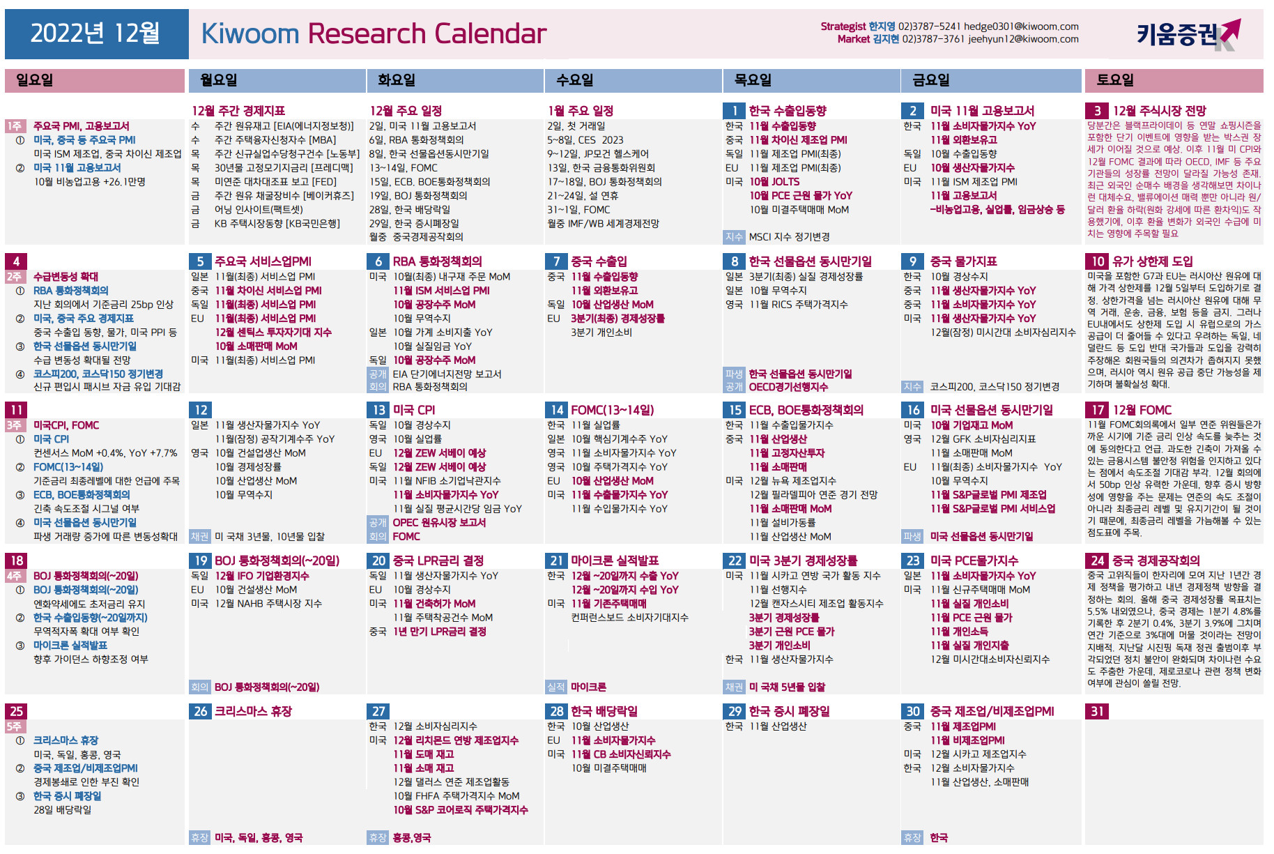다만, 마이너스를 기록할 것으로 예상되는 11월 한국 수출은 부담. 이는 향후 기업이익 둔화 우려를 자극할 것으로 전망되기 때문. 그럼에도 불구하고 미-중 갈등 완화 기대, 중국의 코로나 제로 정책 변화 가능성, 파월 연준 의장의 발언, 그리고 연준이 베이지북을 통해 인플레 하향 안정 기대를 높인 점은 전반적인 투자심리에 긍정적인 영향. 물론, 전일 월말 포트폴리오 조정 관련 외국인의 대규모 순매수로 강세폭이 확대된 영향을 받을 수 있으나, 한국 증시는 1.5% 내외 상승 출발 후 강세를 이어갈 것으로 전망.