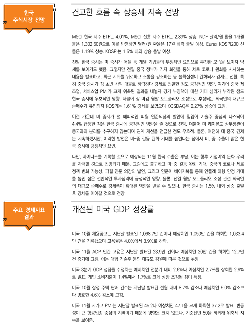 MSCI 한국 지수 ETF는 4.01%, MSCI 신흥 지수 ETF는 2.89% 상승. NDF 달러/원 환율 1개월물은 1,302.50원으로 이를 반영하면 달러/원 환율은 17원 하락 출발 예상. Eurex KOSPI200 선물은 1.19% 상승. KOSPI는 1.5% 내외 상승 출발 예상.