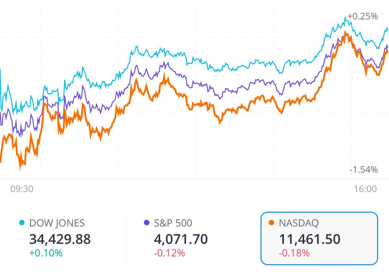 | DOW | 34,429.88 | 34.87 | 0.1% | 16/13/1 |