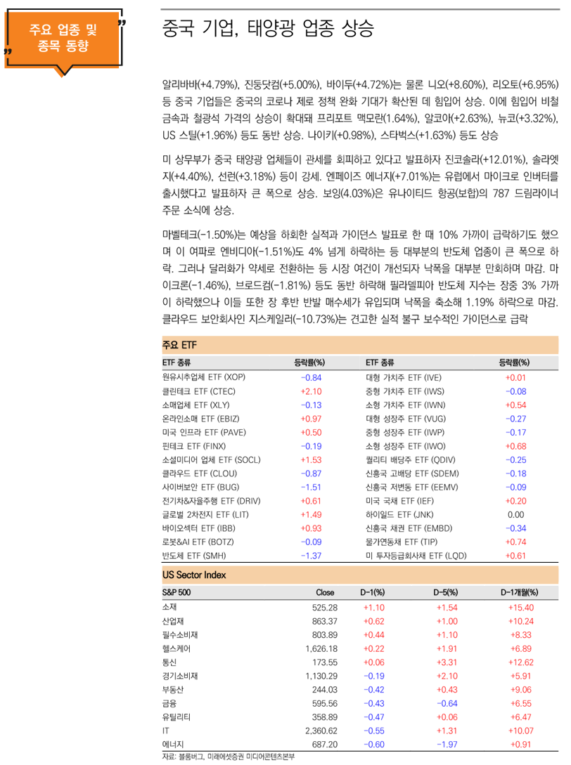 - 중국 ADR 상승세 지속 : JD닷컴(+5.0%), 알리바바(+4.8%), 바이두(+4.7%) 등