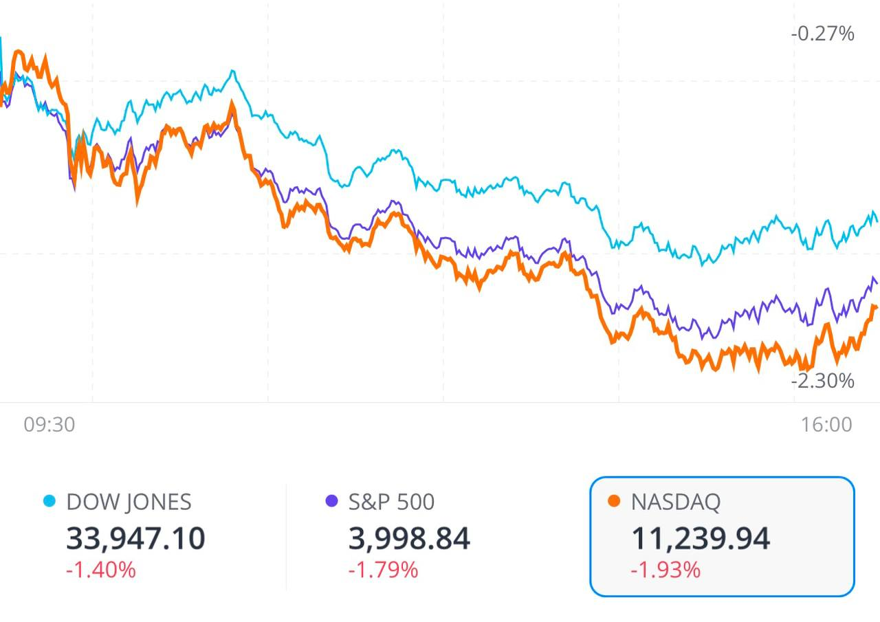 | NASDAQ | 11,239.94 | -221.56 | -1.9% | 853/2600/259 |