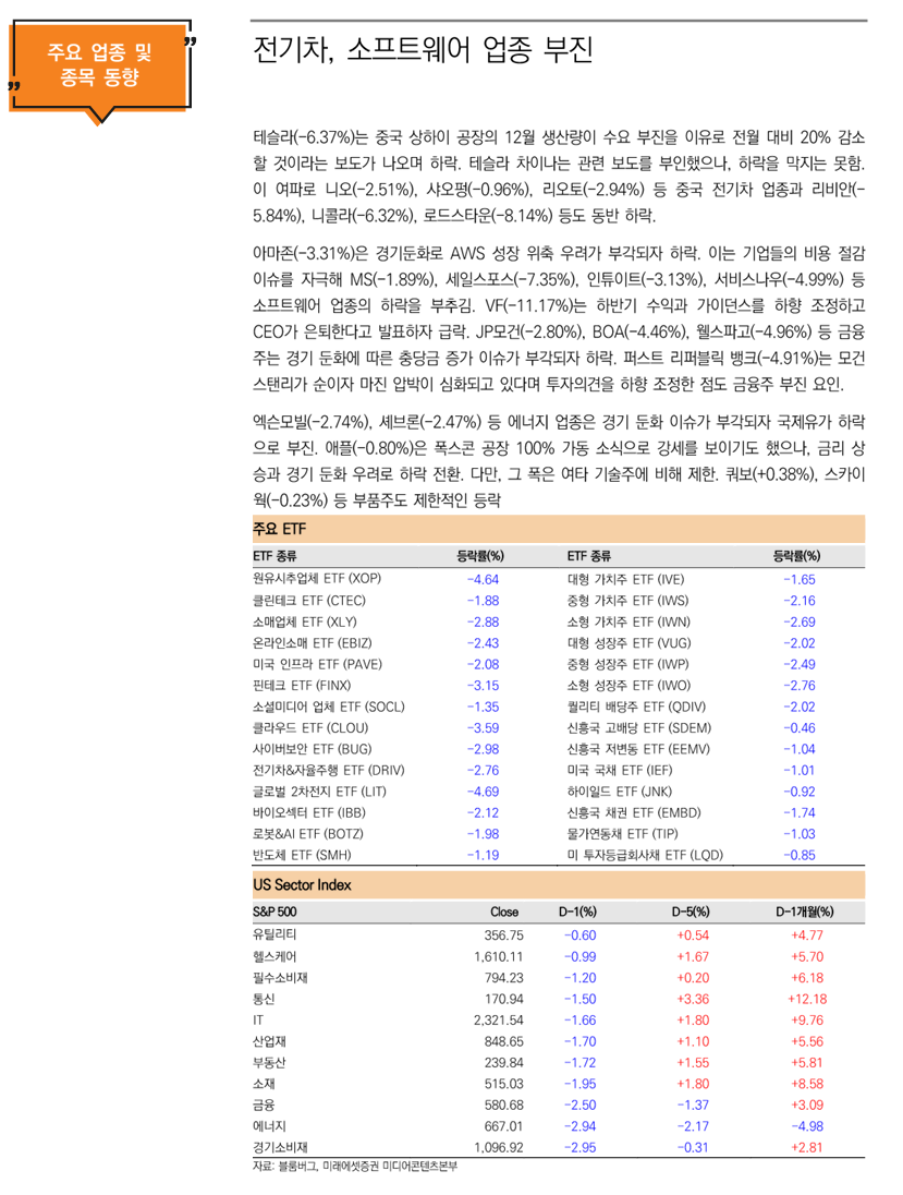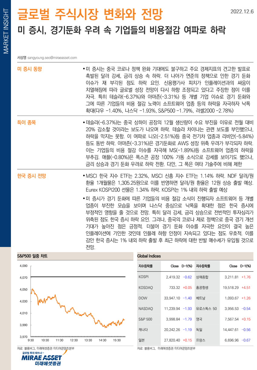 미 증시는 중국 코로나 정책 완화 기대에도 불구하고 주요 경제지표의 견고한 발표로 촉발된 달러 강세, 금리 상승 속 하락. 더 나아가 연준의 정책으로 인한 경기 둔화 이슈가 재 부각된 점도 하락 요인. 신용평가사 피치가 인플레이션과의 싸움이 치열해짐에 따라 글로벌 성장 전망이 다시 하향 조정되고 있다고 주장한 점이 이를 자극. 특히 테슬라(-6.37%)와 아마존(-3.31%) 등 개별 기업 이슈로 경기 둔화와 그에 따른 기업들의 비용 절감 노력이 소프트웨어 업종 등의 하락을 자극하자 낙폭 확대(다우 -1.40%, 나스닥 -1.93%, S&P500 -1.79%, 러셀2000 -2.78%)