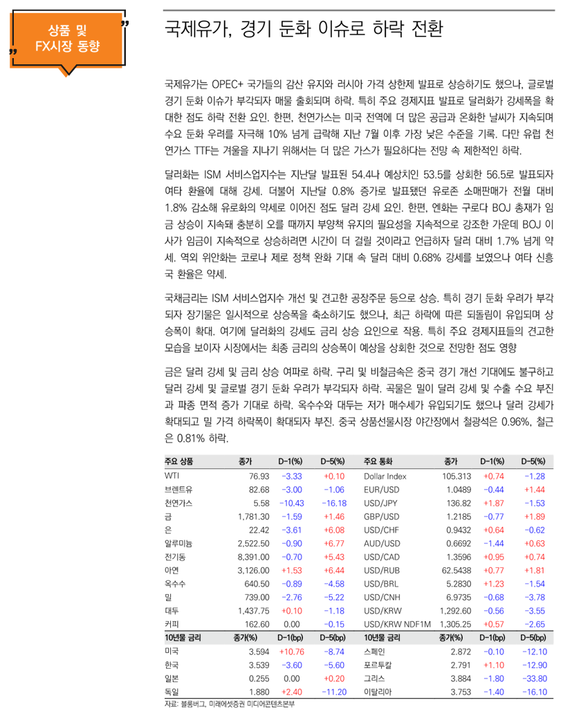 금일 유럽증시는 제조업구매관리자지수(PMI)의 감소 소식에 따른 경기둔화 우려가 상승, 이에 증시 하방압력을 가중하였으나 중국 정부의 제로 코로나 봉쇄 완화 소식이 전해짐에 따라 증시 낙폭을 다소 제한. 가브리엘마크루프 집행이사회 의원은 보다 확실한 인플레이션 압력 억제를 위해서 유럽중앙은행(ECB)이 다음주기준금리 50bp인상을 단행할 수 있을 것이라 언급하며 증시 하락의 주요 원인으로 작용. 한편 미국의 경제 매체 CNBC에 따르면 중국 주요 도시에서 봉쇄령이완화되면서 중국 증시의 향후 전망에 대해 긍정적인 의견들이 제기되고 있다고 보도. 실제 지난 주말 베이징과선전 당국이 코로나19 진단 결과가 음성인 경우 이동제한 조치를 적용하지 않는다고 발표하면서, 중국 경제활동 정상화에 대한 기대감이 커지고 있는 상황이라 평가.