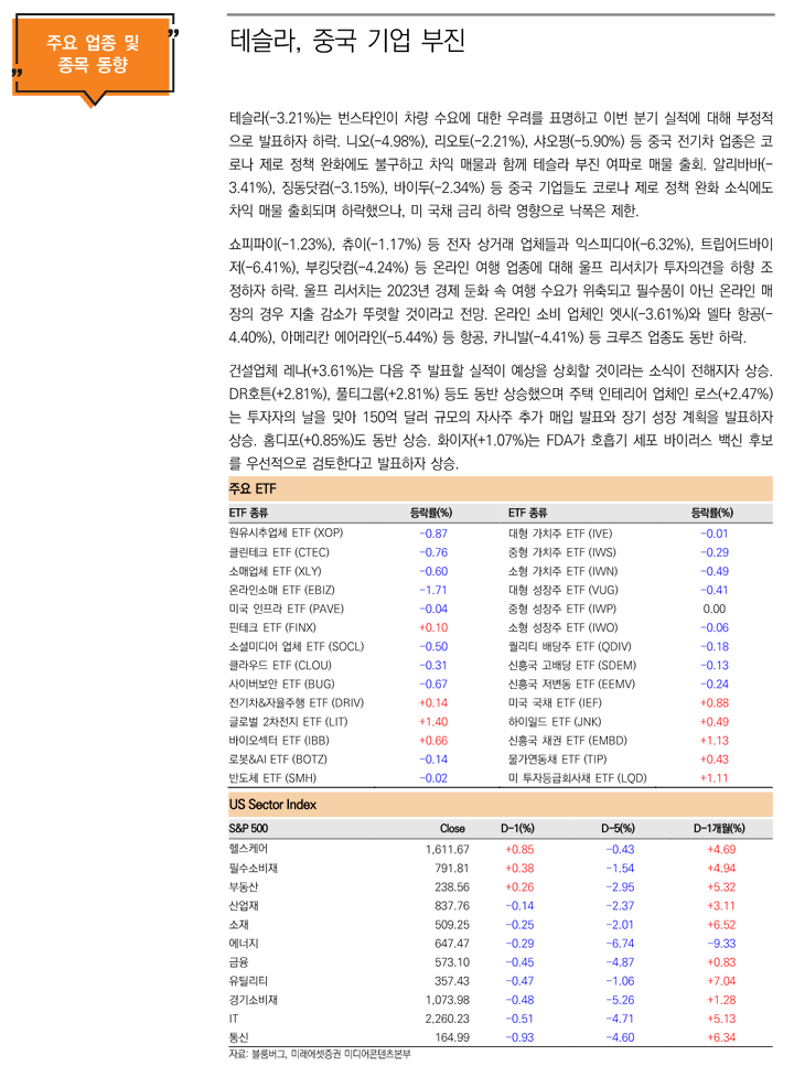 미 증시는 최근 하락에 따른 반발 매수세와 경기침체 이슈의 지속에 따른 매물 출회로 제한적인 혼조세로 출발. 그러나 차량 수요 둔화 우려가 부각된 테슬라(-3.21%)의 약세가 뚜렷한 가운데 출하량 추가 감소 소식이 전해진 애플(-1.38%) 등 개별 기업의 부정적인 요인으로 나스닥의 약세가 지속. 이는 경기 둔화 여파로 해석. 결국, 달러 약세와 국채 금리의 하락폭이 확대되자 반발 매수세가 유입되는 등 변화를 보였으나, 여전한 경기 둔화 우려와 개별 종목 이슈로 나스닥 중심 하락 마감(다우 +0.00%, 나스닥 -0.51%, S&P500 -0.19%, 러셀2000 -0.31%)
