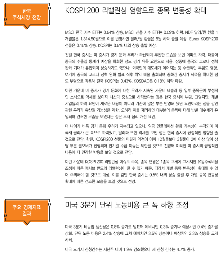 이런 가운데 KOSPI 200 리밸런싱 이슈도 주목. 종목 변경은 1종목 교체에 그치지만 유동주식비율 조정에 따른 패시브 펀드의 리밸런싱이 클 수 있기 때문. 따라서 개별 종목 변동성이 확대될 수 있어 주의해야 할 것으로 예상. 이를 감안 한국 증시는 0.5% 내외 상승 출발 후 개별 종목 변동성 확대에 따른 견조한 모습을 보일 것으로 전망.