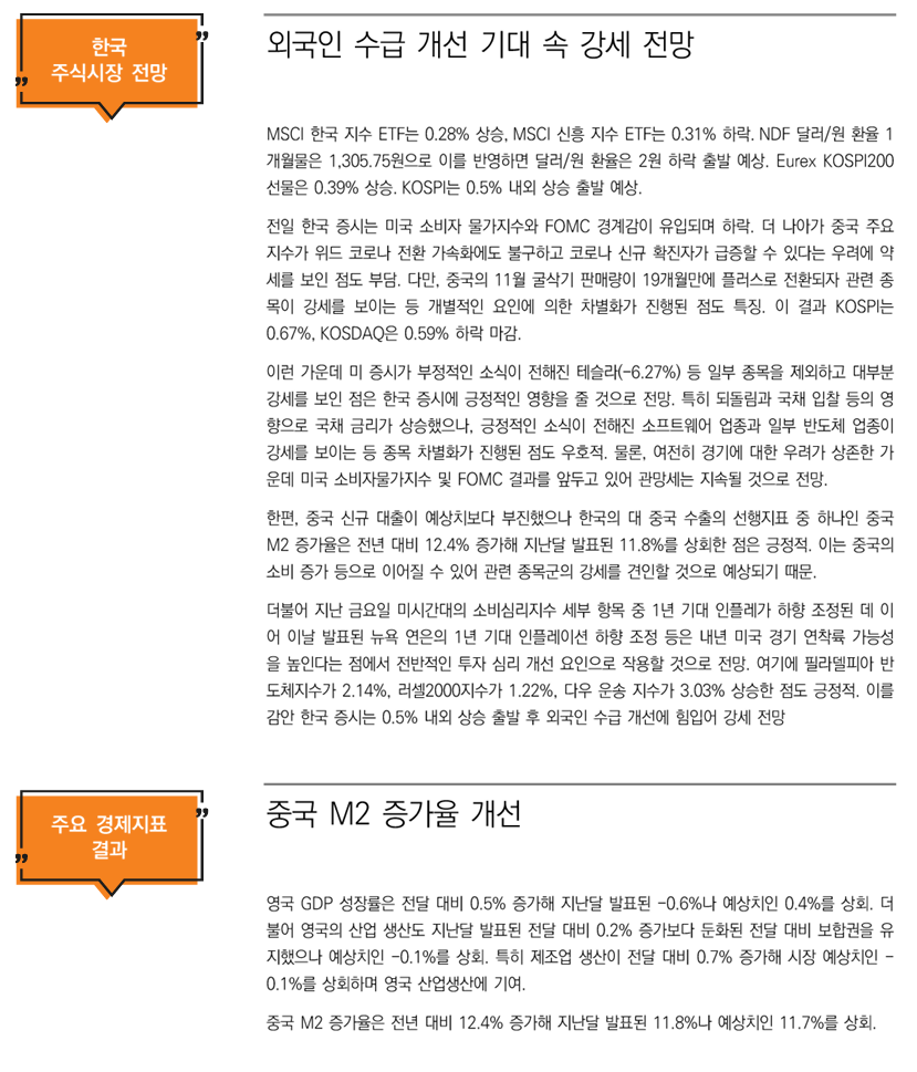 더불어 지난 금요일 미시간대의 소비심리지수 세부 항목 중 1년 기대 인플레가 하향 조정된 데 이어 이날 발표된 뉴욕 연은의 1년 기대 인플레이션 하향 조정 등은 내년 미국 경기 연착륙 가능성을 높인다는 점에서 전반적인 투자 심리 개선 요인으로 작용할 것으로 전망. 여기에 필라델피아 반도체지수가 2.14%, 러셀2000지수가 1.22%, 다우 운송 지수가 3.03% 상승한 점도 긍정적. 이를 감안 한국 증시는 0.5% 내외 상승 출발 후 외국인 수급 개선에 힘입어 강세 전망
