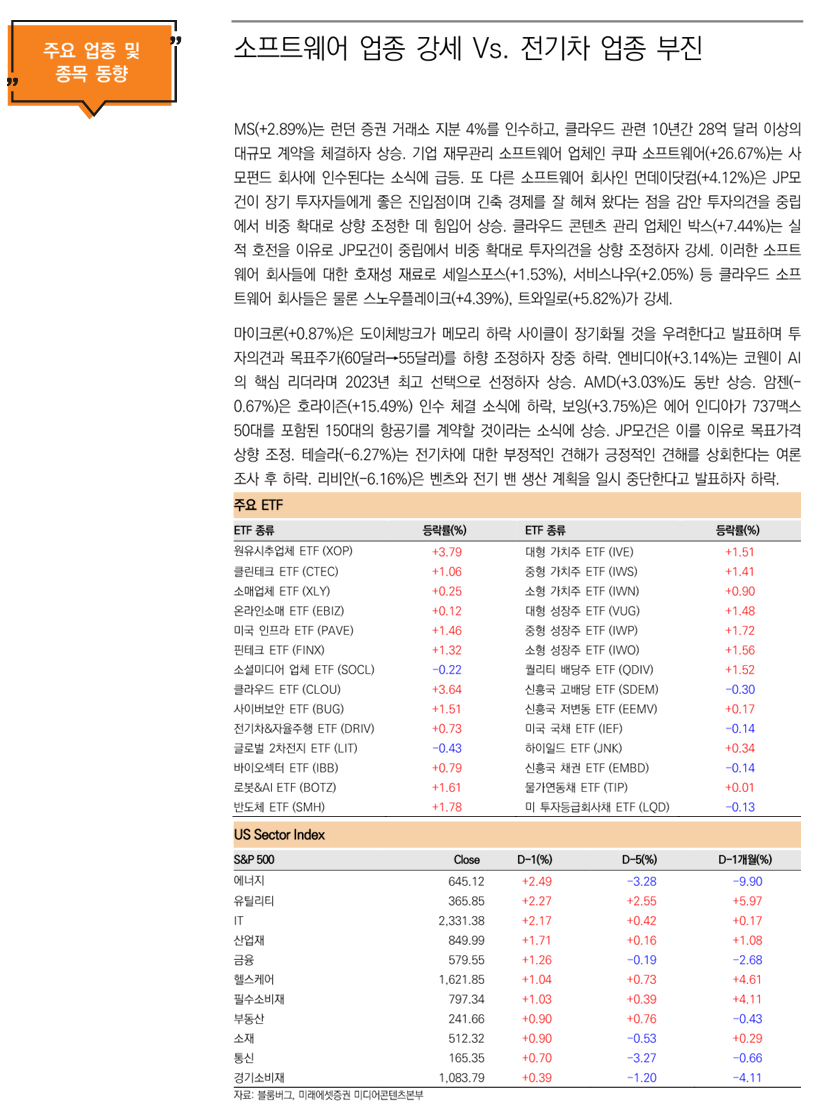 금일 테마 ETF 내 수송(IYT/+2.8%)과 항공방산(XAR/+1.8%) 테마 ETF가 상승 마감 / 특히, 수송(IYT) ETF 섹터 내 익스피디터 인터내셔널(EXPI/+5.0%)와 페덱스(FDX/+2.9%)가 큰폭의 상승세 시현 / 항공방산(XAR) 테마 ETF 섹터 내 머큐리 시스템(MRC/+5.6%)가 큰폭의 상승세 시현
