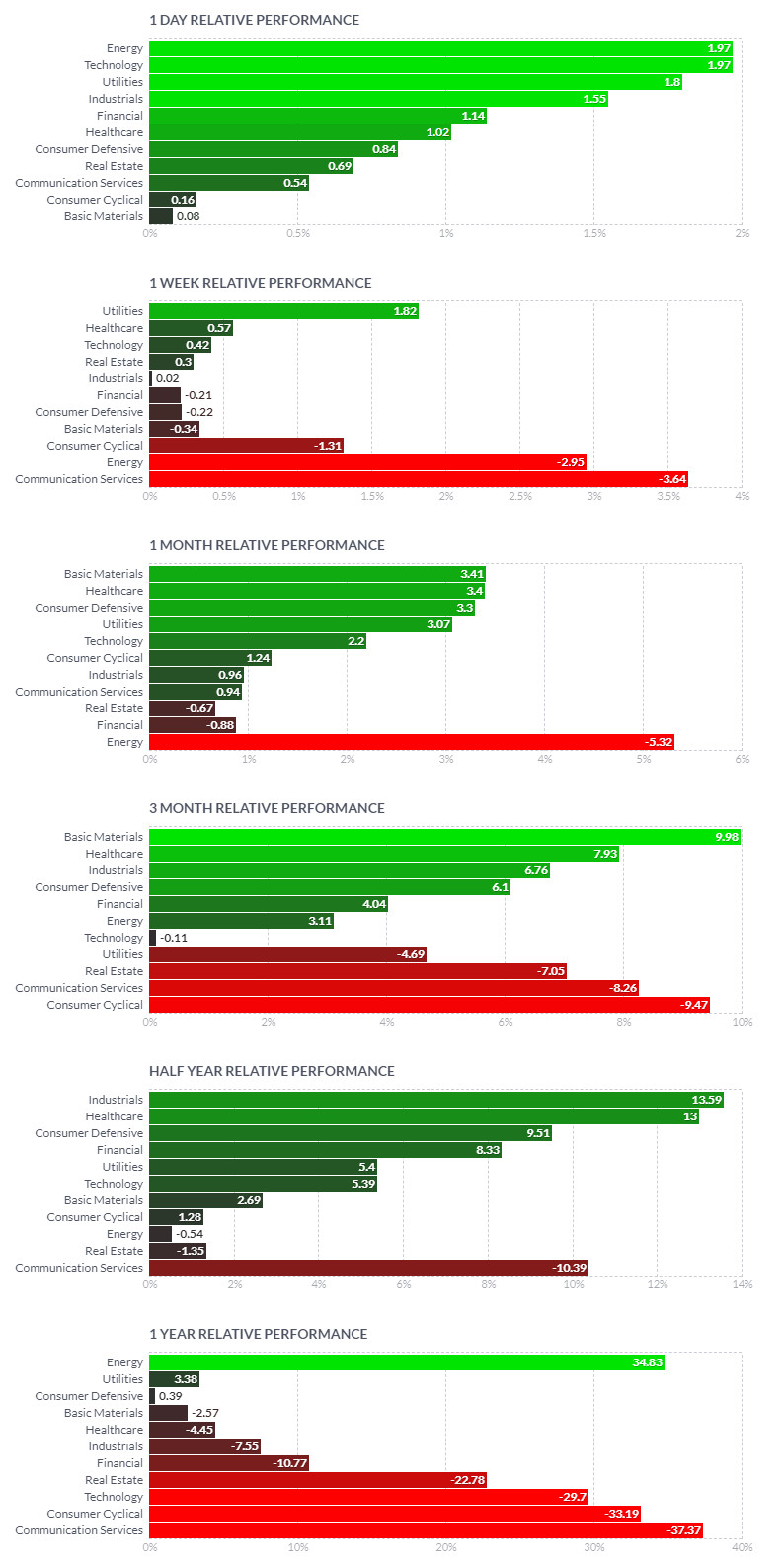 금일 섹터 ETF 내 에너지(XLE/+2.6%) ETF와 유틸리티(XLU/+2.3%) ETF 섹터가 상승세 시현 / 에너지(XLE) ETF 섹터는 금일 푸틴 대통령이 러시아산 원유 가격 상한제에 필요시 석유 생산 감산을 고려할 것이라는 전망에 해당 섹터에 상승 압력으로 작용 / 해당 섹터 ETF 내 APA(APA/+4.9%)와 베이커 휴즈 (BKR/+3.8%)가 큰 폭의 상승세 시현