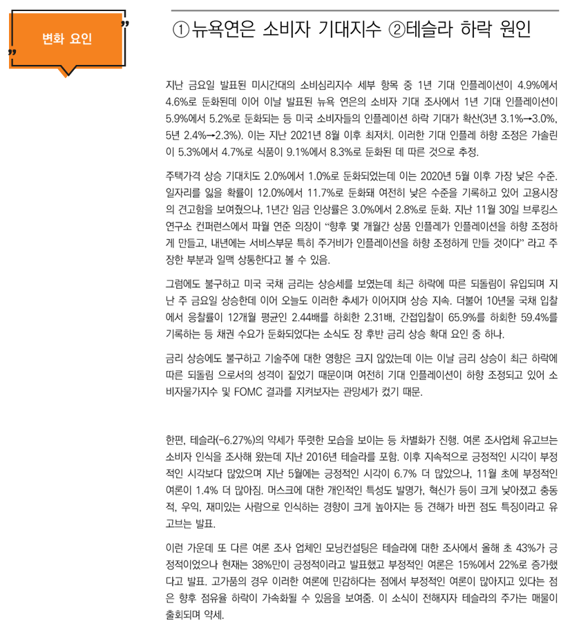 변화요인: ①뉴욕연은 소비자 기대지수 ②테슬라 하락 원인