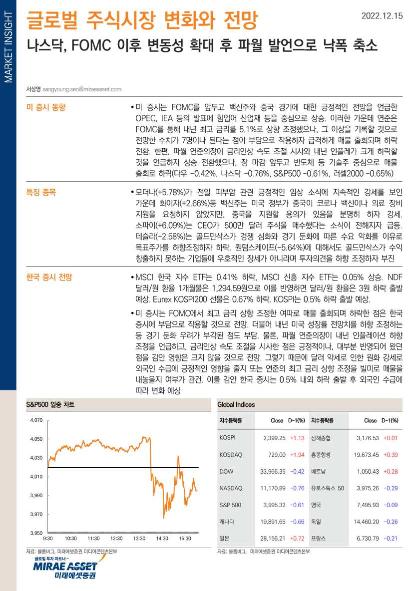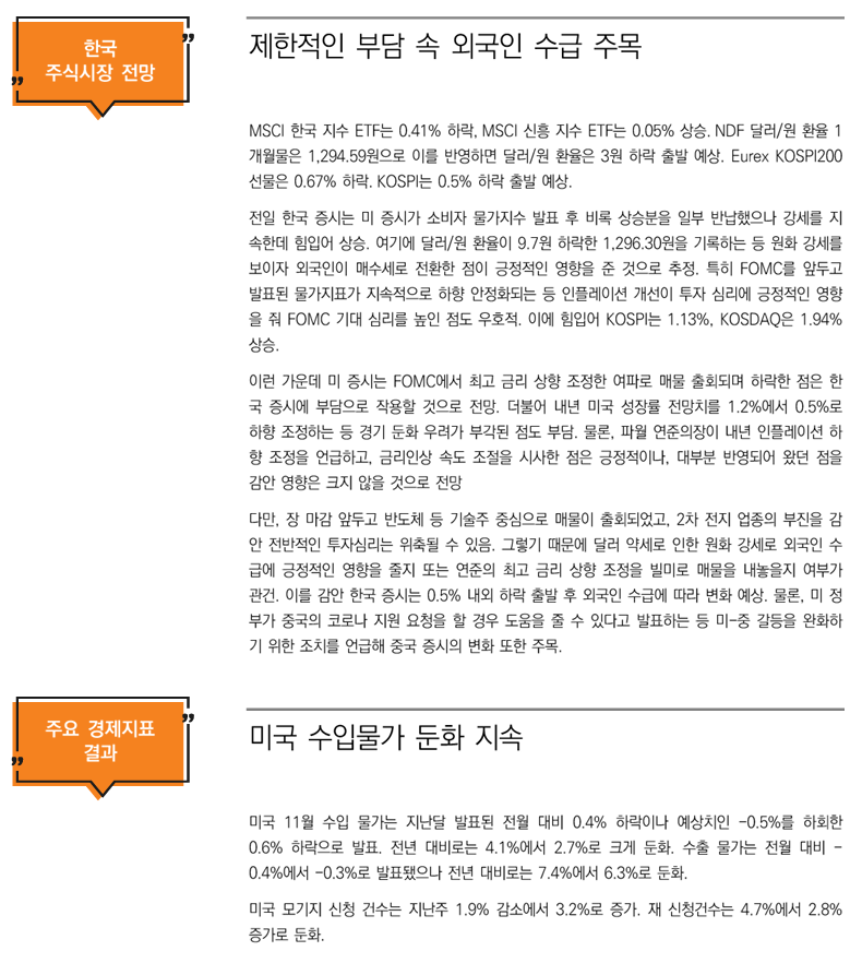 미 증시는 FOMC에서 최고 금리 상향 조정한 여파로 매물 출회되며 하락한 점은 한국 증시에 부담으로 작용할 것으로 전망. 더불어 내년 미국 성장률 전망치를 1.2%에서 0.5%로 하향 조정하는 등 경기 둔화 우려가 부각된 점도 부담. 물론, 파월 연준의장이 내년 인플레이션 하향 조정을 언급하고, 금리인상 속도 조절을 시사한 점은 긍정적이나, 대부분 반영되어 왔던 점을 감안 영향은 크지 않을 것으로 전망