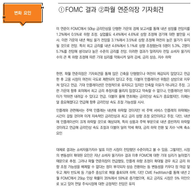 다만, 장 마감 앞두고 반도체 등 기술주 중심으로 매물이 출회되었고, 2차 전지 업종의 부진을 감안 전반적인 투자심리는 위축될 수 있음. 그렇기 때문에 달러 약세로 인한 원화 강세로 외국인 수급에 긍정적인 영향을 줄지 또는 연준의 최고 금리 상향 조정을 빌미로 매물을 내놓을지 여부가 관건.