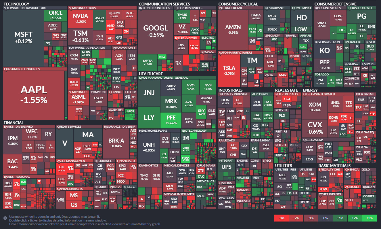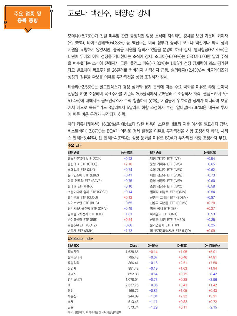 금일 섹터 ETF는 헬스케어(XLV/+0.16%)를 제외한 섹터 ETF가 하락 마감 / 헬스케어(XLV) ETF 섹터 내 모더나(MRNA/+5.78%)와 화이자(PFE/+2.69%)가 큰 폭의 상승세 시현