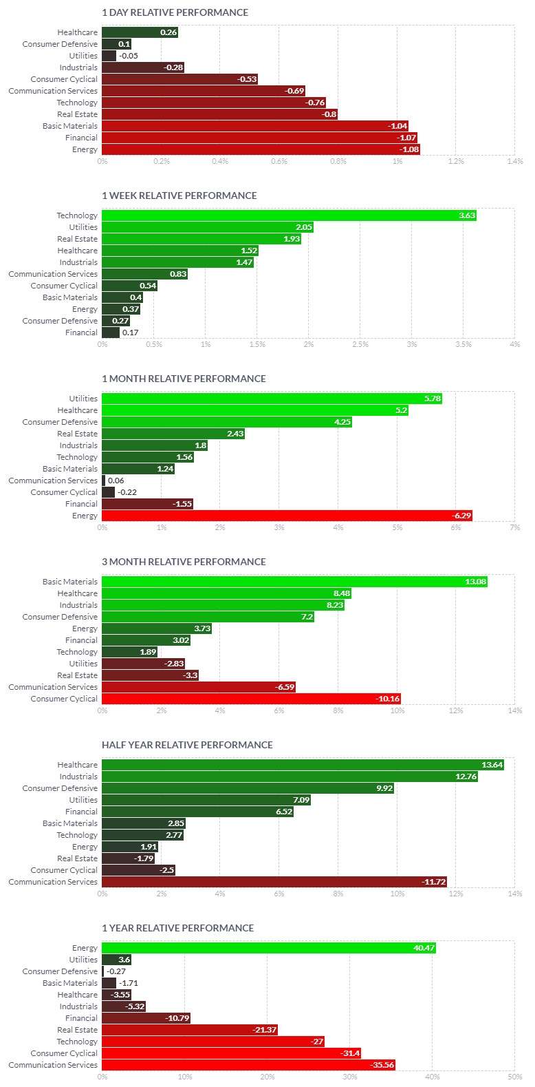 | 커뮤니케이션 | XLC | 50.0 | -1.3% | 햇빛 | 0.7% | -0.1% | -33.5% |