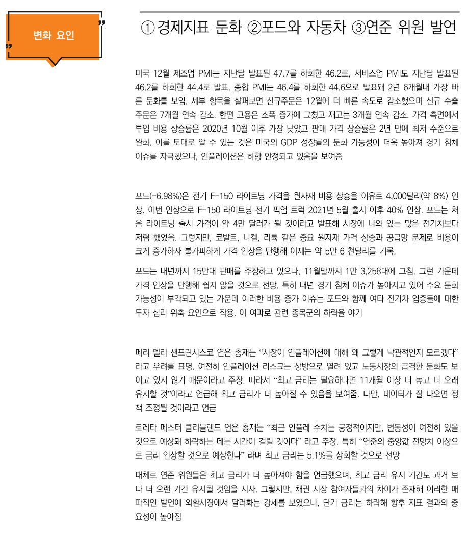 •12월 FOMC 이후 경기침체가 오더라도 연준이 꽤 장기간 금리인하를 하지 않을 것이라는 불안감이 시장을 장악했고, 12월 옵션만기가 맞물려 변동성이 확대된 상황으로 판단, 그러나 단기국채금리는 오히려 연이틀 하락하며 시장이 연준의 스탠스(2023년 금리인하 X)를 크게 신뢰하지 않는 상황