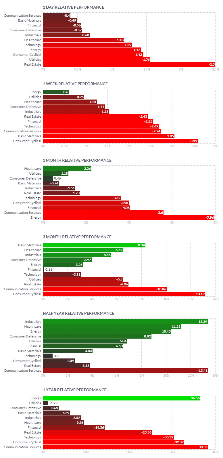 금일 섹터 ETF는 모든 섹터 ETF가 2 거래일 연속 일제히 하락 마감 / 특히 부동산(VNQ/-2.6%) ETF 섹터와 유틸리티(XLU/-1.7%)가 큰폭의 하락세 시현 / 특히 부동산(VNQ) 섹터 ETF는 최근 세계의 주요 중앙은행이 매파적 기조를 띄임에 따라 추가적 금리인상과 경기둔화에 부동산 섹터 ETF에 하락폭 확대 / 부동산(VNQ) 섹터 ETF 내 오픈도어 테크놀로지스(OPEN/-10.00%)와 케네디 월슨 홀딩스(KW/-6.60%)가 큰 폭의 하락세 시현