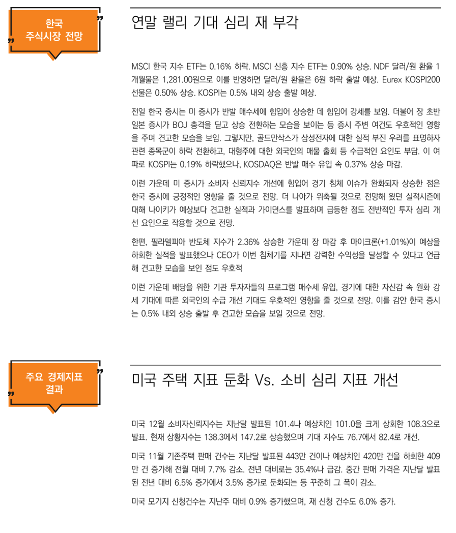 이런 가운데 배당을 위한 기관 투자자들의 프로그램 매수세 유입, 경기에 대한 자신감 속 원화 강세 기대에 따른 외국인의 수급 개선 기대도 우호적인 영향을 줄 것으로 전망. 이를 감안 한국 증시는 0.5% 내외 상승 출발 후 견고한 모습을 보일 것으로 전망.