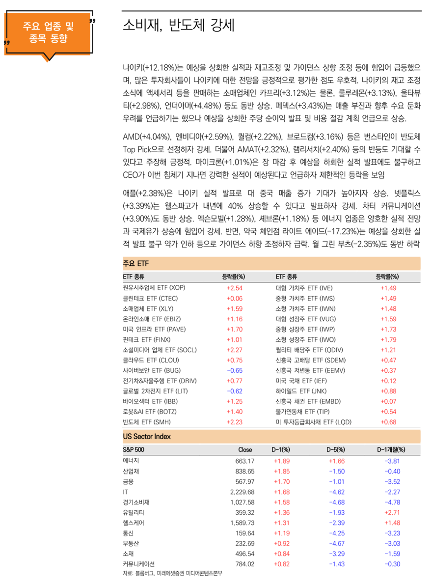미 증시가 소비자 신뢰지수 개선에 힘입어 경기 침체 이슈가 완화되자 상승한 점은 한국 증시에 긍정적인 영향을 줄 것으로 전망. 더 나아가 위축될 것으로 전망해 왔던 실적시즌에 대해 나이키가 예상보다 견고한 실적과 가이던스를 발표하며 급등한 점도 전반적인 투자 심리 개선 요인으로 작용할 것으로 전망.