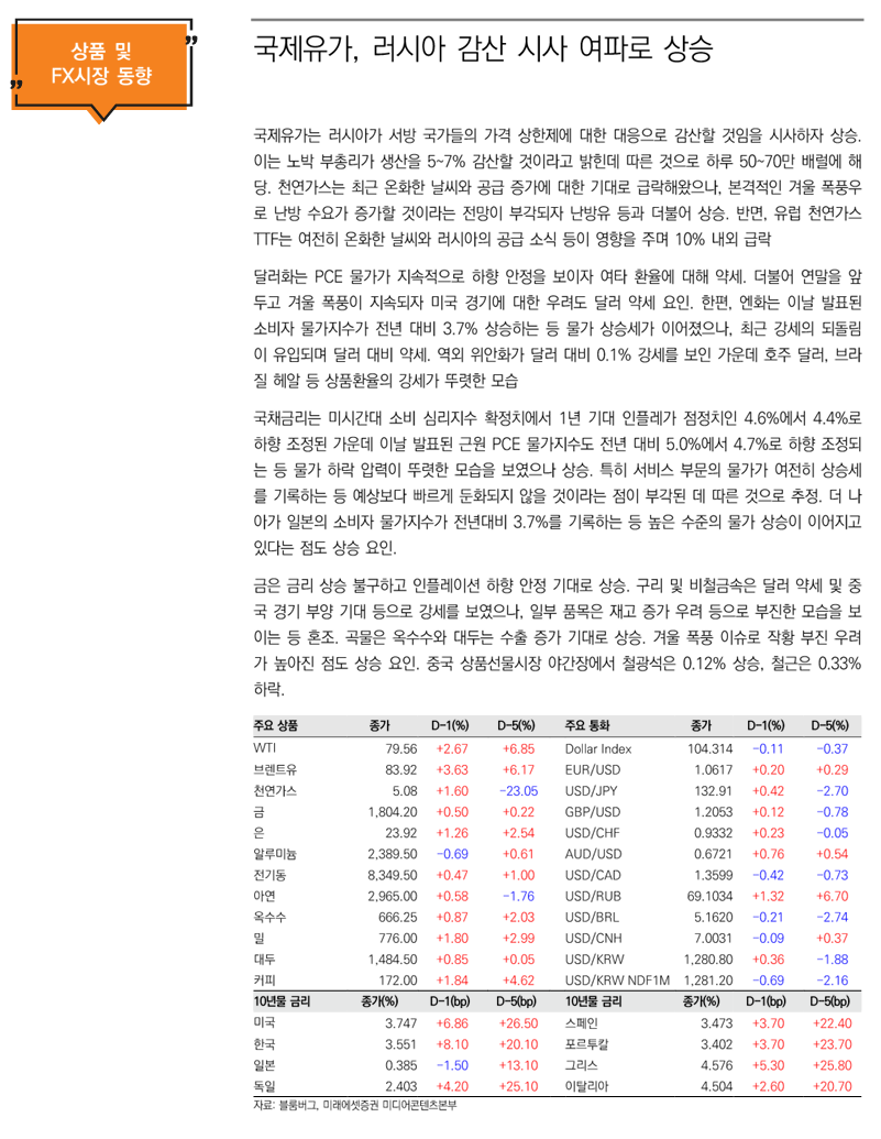 금일 유럽증시는 성탄절 연휴를 앞두고 혼조 마감 / 지난 주 유럽 주요국과 유럽의 중앙은행이 지속적인 매파 기조의 충격이 시장에 여전히 남아있다는 분석이 제기 / 한편, 유럽연합의 러시아 원유가격 상한제 이후 러시아 원유 수출이 52% 감소 / 로이터 통신에 따르면 원유 가격 상한제에 대한 대응으로 러시아가 최대 7%의 석유 감산안을 추진할 것으로 전망 / 러시아의 하루 석유 생산량이 약 1천만 배럴임을 고려하면 하루 50~70만 배럴 감산 가능성 확대 / 또한, 유럽연합(EU)이 제조 공정에서 탄소를 배출하는 수입품에 부과하기로 한 ‘탄소 국경세’를 두고 관련 업계에서의 우려가 확산 / 유럽 제조업은 우크라이나 전쟁, 코로나 팬데믹 여파로 인한 에너지, 원자재값 급등 에 위기를 겪고 있으며, 탄소국경조정제도 시행에 수입 원자재를 활용해 가공하는 현지 철강산업의 가격 경쟁력이 떨어질 것으로 전망