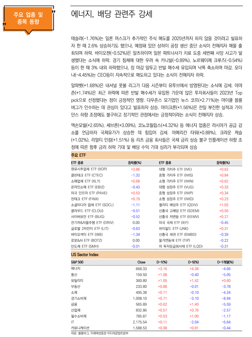 미 증시는 물가 안정이 지속되고 있는 가운데 경기 침체 이슈가 부담을 주며 하락 출발. 그런 가운데 개별 종목군의 변화로 보합권 등락을 보이던 지수는 상승 마감. 특히 국제유가 급등에 따른 에너지 업종과 배당주 중심으로 매수세가 유입된 점이 긍정적인 영향. 더불어 아마존(+1.74%)과 알파벳(+1.68%) 등의 상승과 테슬라(-1.75%)의 하락 등 개별 종목군의 변화에 따른 종목 차별화가 진행된 가운데 소폭 상승 마감(다우 +0.53%, 나스닥 +0.21%, S&P500 +0.59%, 러셀2000 +0.39%)