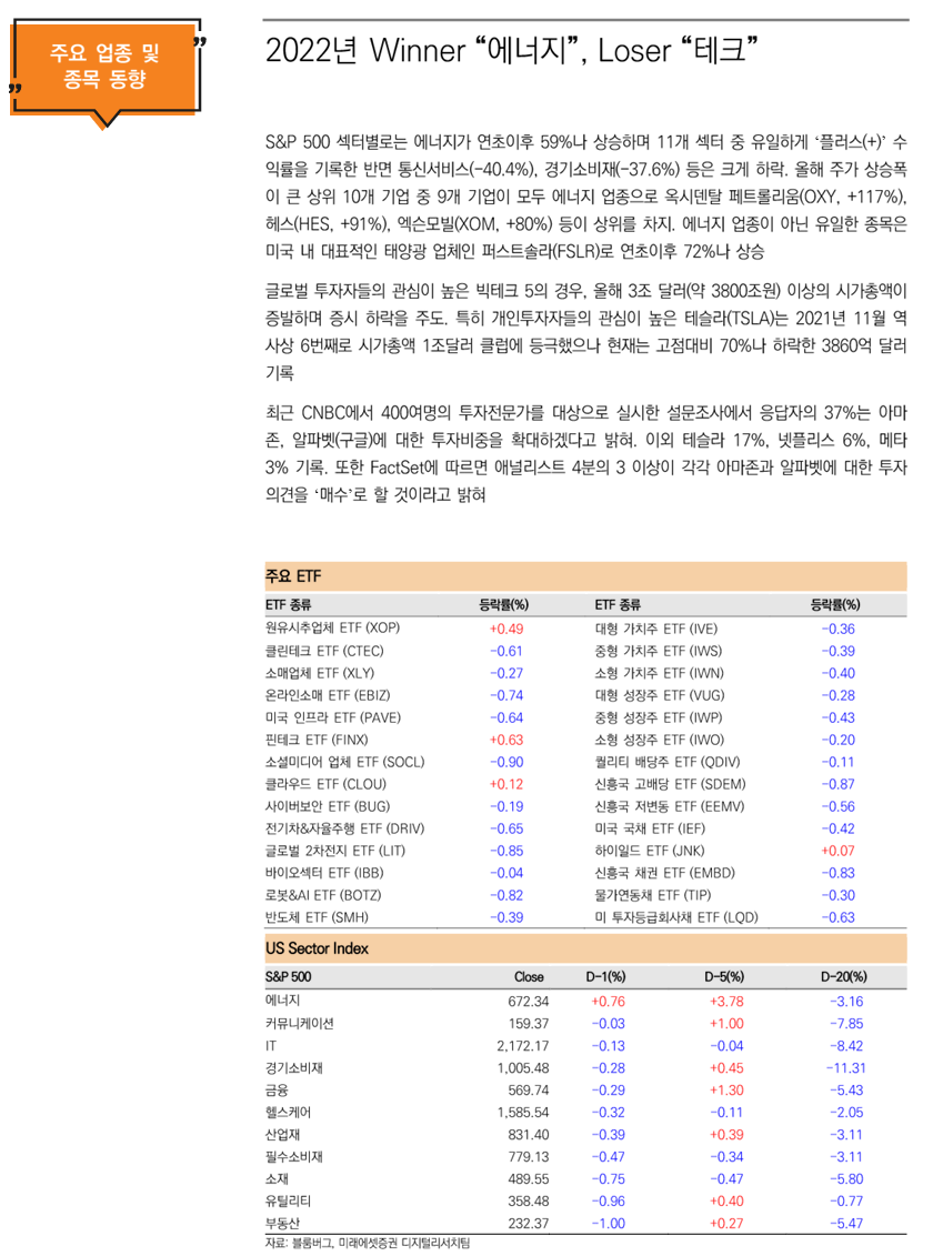 섹터별 ETF는 커뮤니케이션(XLC/+2.7%)섹터와 IT(XLK/+2.6%)섹터가 상승을 주도함. Wall Street Barron's는 CES 2023 개최가 임박한 가운데, 이것이 IT 섹터 투자심리를 대대적으로 견인하기는 어려울 것임을 보도함. 코로나19 판데믹 발생 이후 크게 축소되었던 CES 행사가 오는 1월 6~8일 동안 정상 개최될 예정인데, '22년 미국 증시가 약세장을 경험하고 특히 IT 섹터가 매우 저조한 성적을 거뒀던 가운데, CES 2023은 IT 섹터에 대한 투자심리 개선이 견인되는 중요한 전환점이 될 것임을 덧붙임. 그러나 IT 섹터는 이제 공급체인 차질에서는 벗어난 반면, 반도체 재고 과잉을 경험하고 있으며, 미-중 마찰이 대중국 반도체 기술 수출 제재 등으로 현실화되면서 중요한 시장인 중국에서의 영업에 차질을 겪고 있는 부분을 지적함. 또한, 차세대 컴퓨팅 플랫폼으로 주목받고 있는 메타버스는 여전히 초기 단계에 머무르고 있으며 플랫폼의 전환을 가져올 만큼 분명한 성장세 견인을 보여주지 못하고 있는 부분과, 동영상 스트리밍 서비스가 경쟁심화로 인해 실적이 저조한 부분, 그리고 자율주행 기술은 여전히 광범위한 도입을 논의하기에는 지나치게 이른 시기일 것으로 분석함.